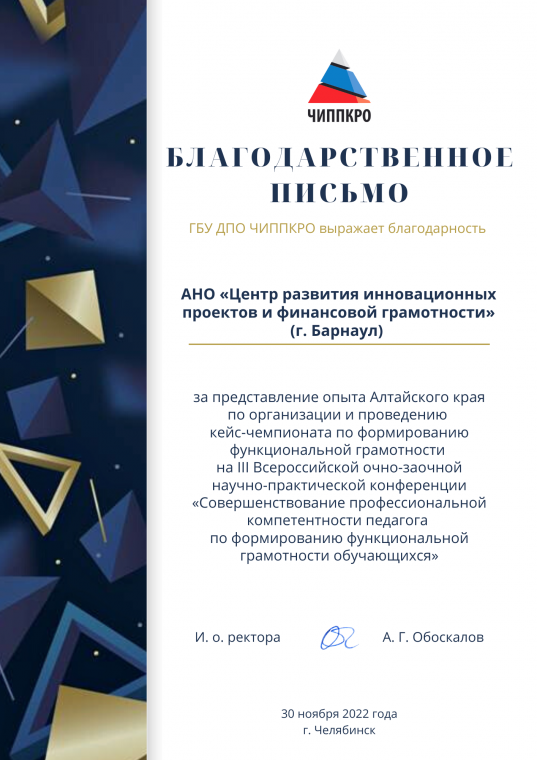 Проект направлен на формирование функциональной грамотности и личностных компетенций обучающихся, необходимых для конструктивного, успешного и ответственного поведения в обществе, понимания ответственности за настоящее и будущее нашей страны! Проект предполагает проведение кейс-чемпионата по функциональной грамотности для школьников Алтайского края и направлен на развитие различных компонентов функциональной грамотности: креативного мышления, читательской, математической, естественнонаучной и финансовой грамотности, глобальных компетенций школьников.